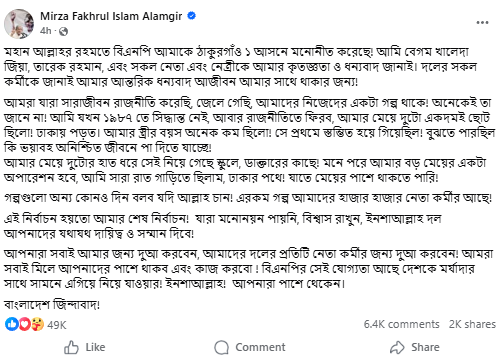 মির্জা ফখরুল বলেন, ‘এই নির্বাচন হয়তো আমার শেষ নির্বাচন! যারা মনোনয়ন পায়নি, বিশ্বাস রাখুন, ইনশাআল্লাহ দল আপনাদের যথাযথ দায়িত্ব ও সম্মান দিবে!’