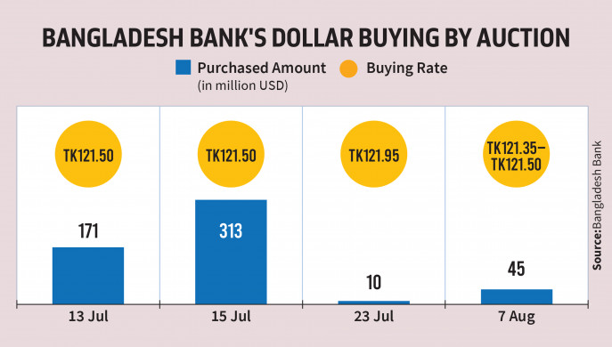 এই ধারাবাহিক হস্তক্ষেপ শুরু হয় ১৩ জুলাই। সেদিন ইতিহাসে প্রথমবারের মতো নিলামের মাধ্যমে ১২১.৫০ টাকা রেটে ১৭১ মিলিয়ন ডলার কেনে কেন্দ্রীয় ব্যাংক। এরপর ১৫ জুলাই ব্যাংকগুলোর কাছে থেকে নিলামে একই দামে আরও ৩১৩ মিলিয়ন ডলার কেনে। কর্মকর্তারা বলছেন, মূলত ডলারের দ্রুত দরপতন ঠেকাতে বাজারের সিগন্যাল রেট নির্ধারণে ডলার কিনছে বাংলাদেশ ব্যাংক।